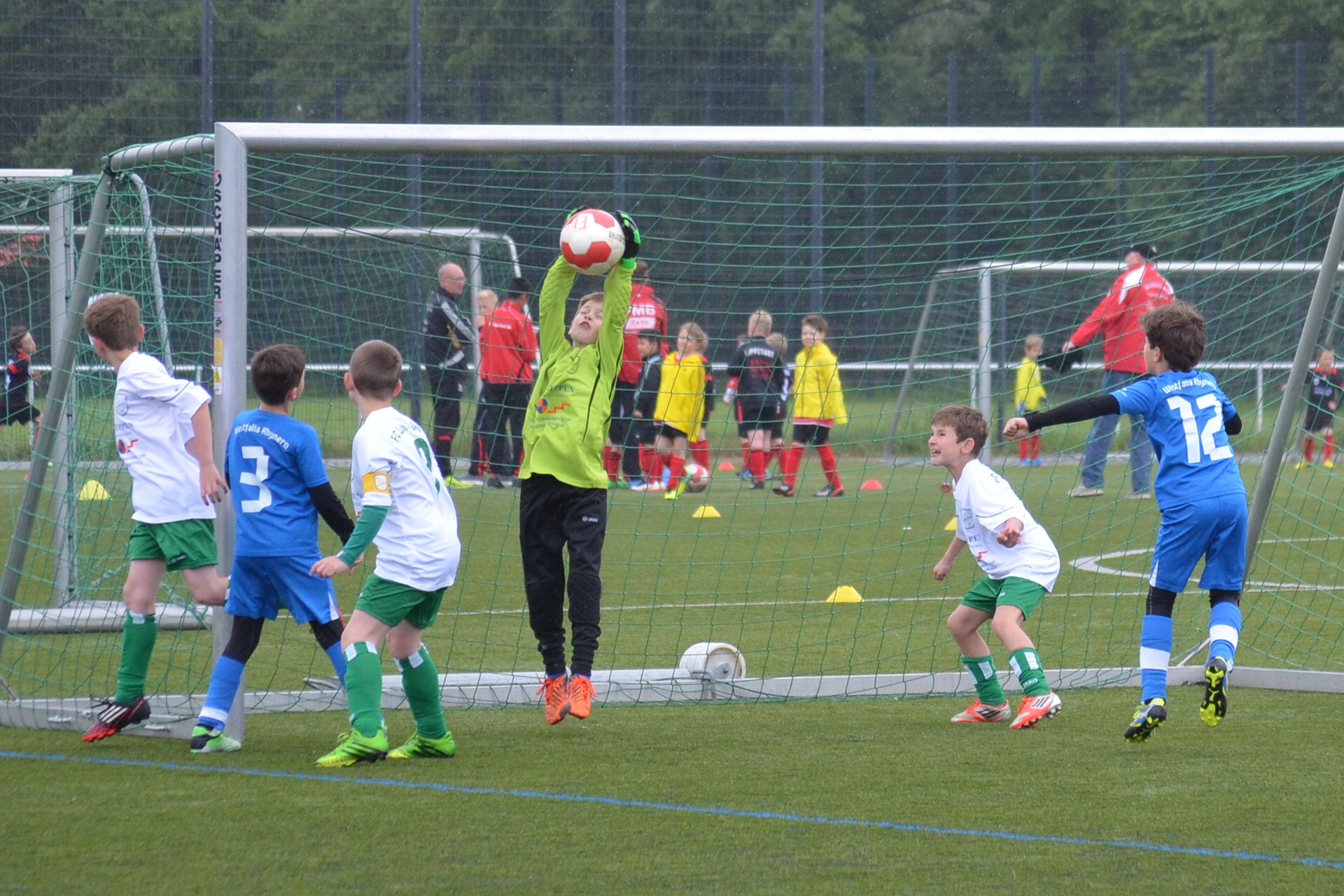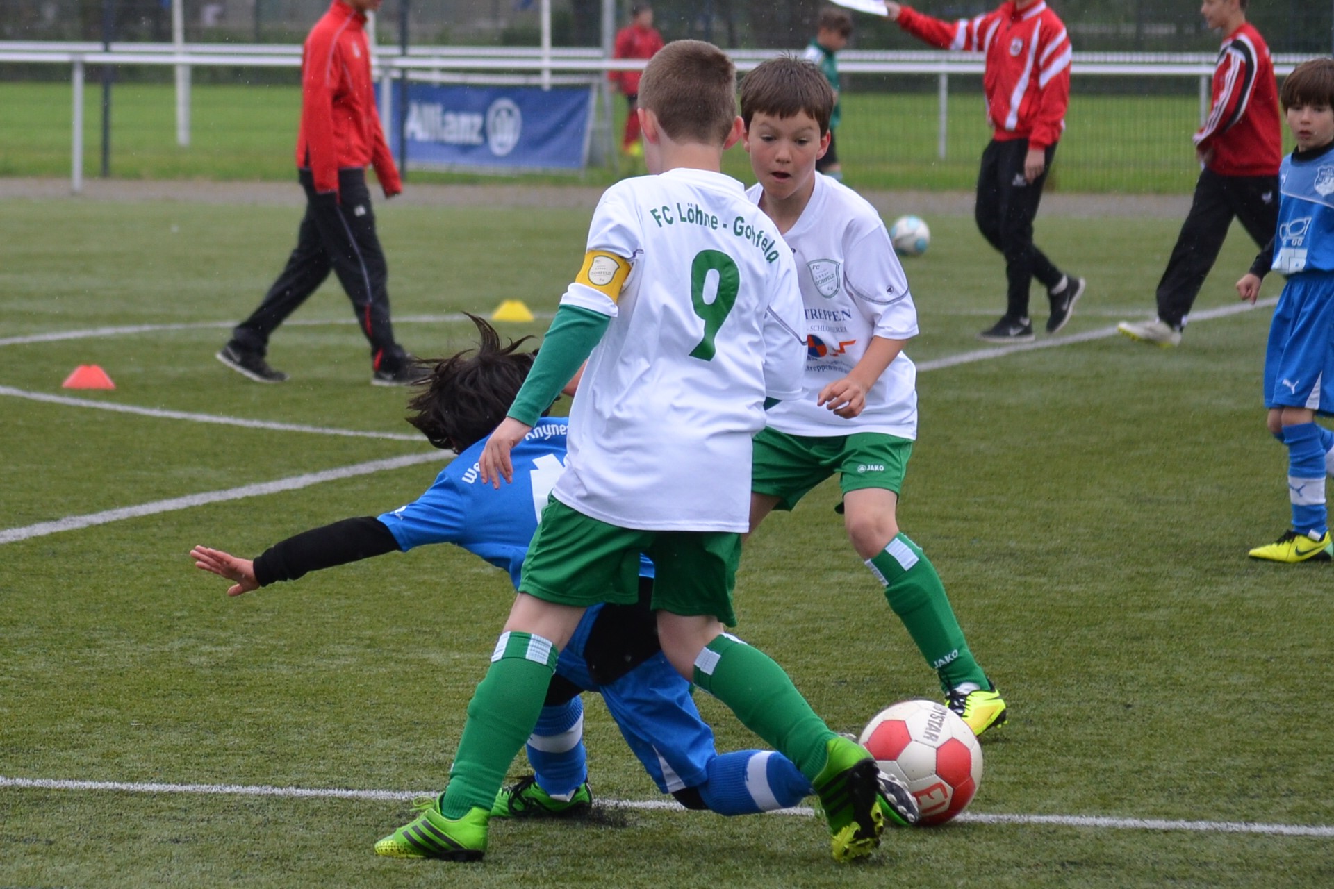 Am 29.05.2014 hieß es für unsere Jungs früh aufstehen, denn das Turnier fand im 74 km entfernten Lippstadt statt. Die Mannschaft des SV Lippstadt 08 war schon 2x beim Turnier des FC Löhne-Gohfeld angetreten und so folgten wir Ihrer Einladung zu Ihrem Turnier. Es waren 12 Mannschaften am Start (3 4er Gruppen). Die Gruppenphase bestritten wir mit 9 Punkten und 14:1 Toren. Im Viertelfinale siegten wir nach 2 maligen Rückstand mit 3:2. Es folgte ein spannendes Halbfinale das zur regulären Spielzeit 1:1 endete. Im entscheidenden 9-Meterschießen verloren wir mit 2:3. Somit spielten wir um Platz 3 und 4. Bei den Jungs merkte man jetzt aber das Ihre Kräfte nachließen und das Spiel ging mit 1:2 verloren. Trotz des schlechten Wetters spielten unsere Jungs ein starkes kämpferisches Turnier.